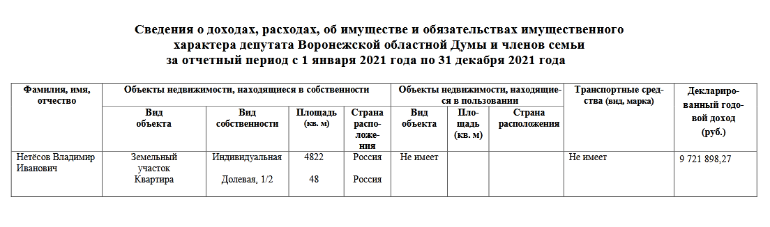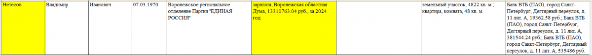 В данных о доходах и имуществе за 2024 год у Владимира Нетесова значится единственный источник доходов – зарплата в Воронежской облдуме. Ее размер составил 13 млн 310 тысяч 763 рубля и 4 копейки.