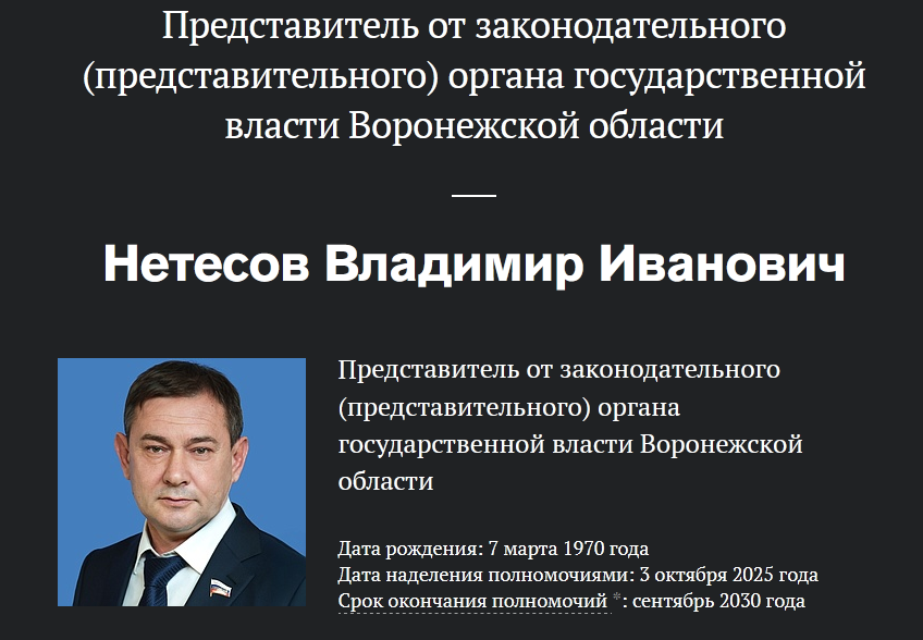 И все-таки не совсем красиво с Владимиром Ивановичем поступили в Воронежской облдуме. Нравится ли кому-то Нетесов или нет, но стоит учитывать его новый государственный статус – сенатора. А кроме того, Владимир Иванович был с 2011 года четыре года заместителем председателя облдумы (у Ключникова), а затем, дважды, с 2015 года по 2025 год, был председателем регионального парламента.