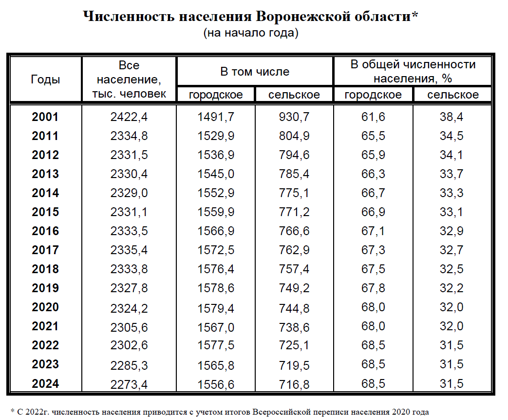 По прогнозу облправительства, численность населения нашей области будет сокращаться и после 2026 года: в 2027-м она составит 2 млн 230 тысяч человек, а в 2028-м – уже 2 млн 220 тысяч. По данным Воронежстата, численность населения нашей области с начала текущего столетия, с 2001 года, уменьшится за 27 лет примерно на 200 тысяч человек.
