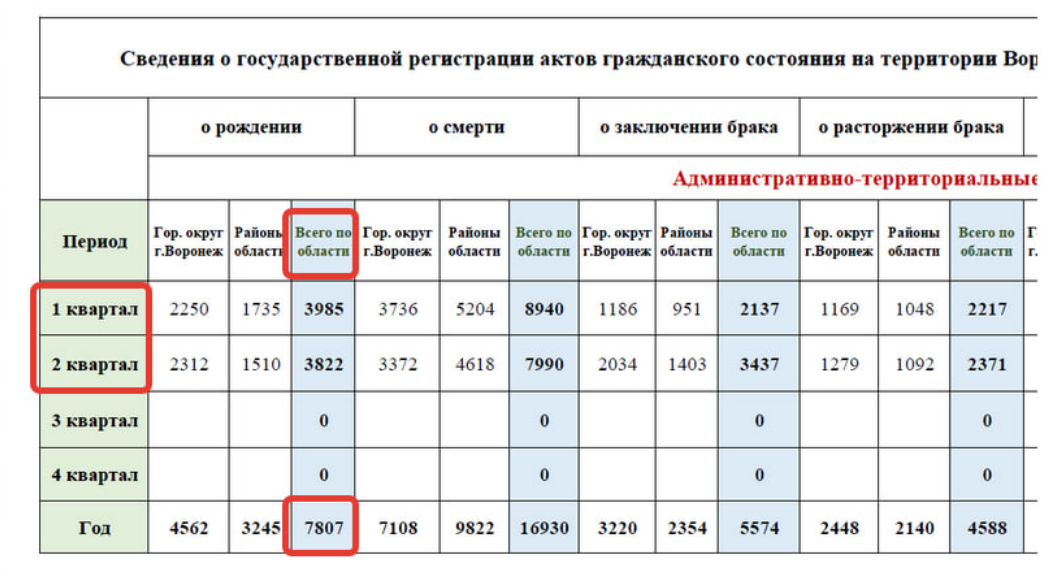 В таком случае речь может идти о резком сокращении количества рождений детей в минувшем квартале, в июле - сентябре. Проверить данную информацию сегодня невозможно, так как областное Управление ЗАГС, Воронежстат, Росстат и иные госструктуры практически перестали раскрывать демографические данные с прошлой весны.