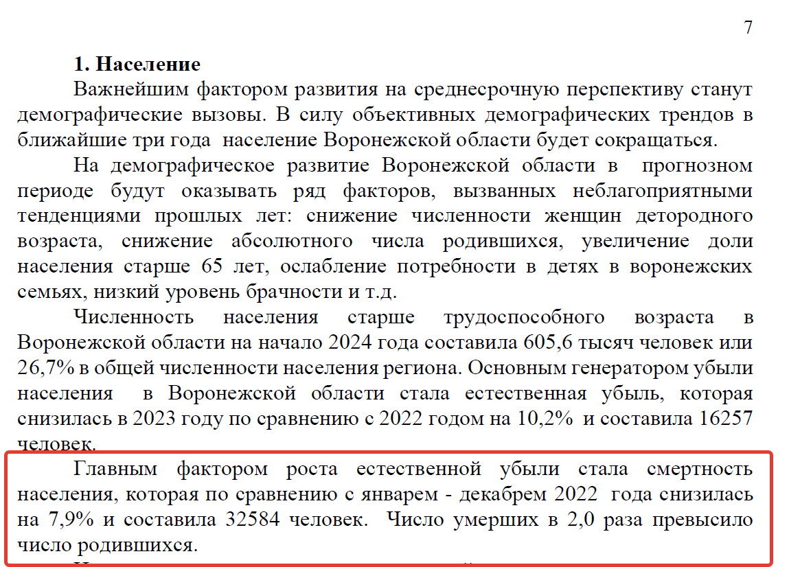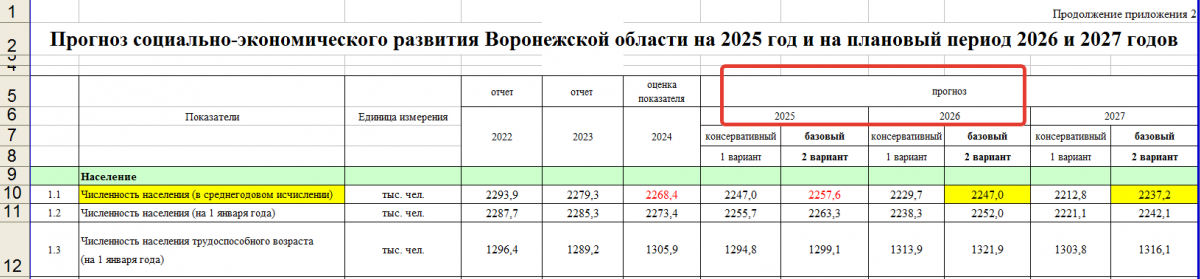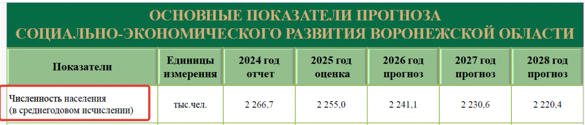 Стоит отметить, что в правительстве Воронежской области существенно ухудшили свой же прогноз: в октябре прошлого года провинциальное Минэкономразвития сообщало, что численность населения (в среднегодовом исчислении) составит в 2026 году 2 млн 247 тысяч человек, а теперь чиновники говорят о 2 млн 241 тысяч человек, то есть на 6000 меньше от их прошлогоднего прогноза.