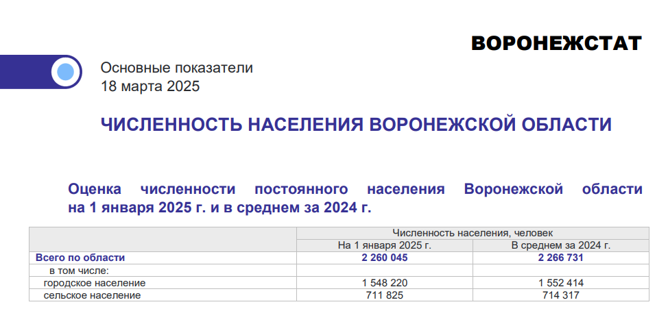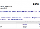 скриншот Воронежстата, на 01.01.2025 г. численность населения области была 2 млн 260 тысяч человек.