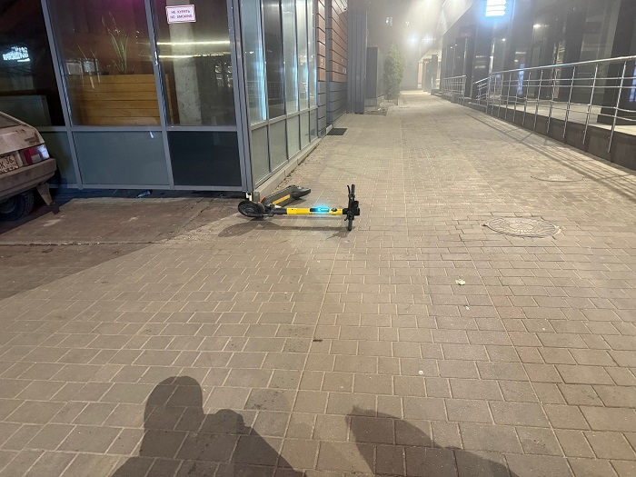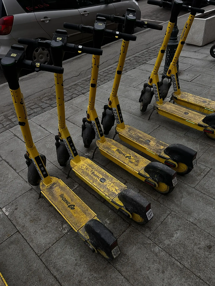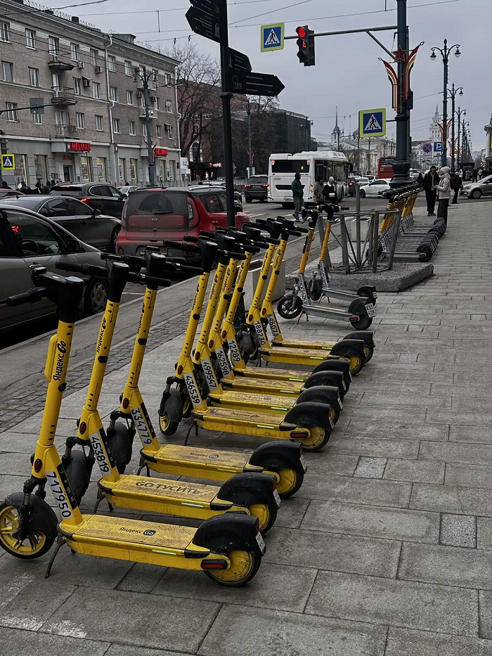 Самокаты выстроены ровными рядами у остановок общественного транспорта, торговых центров и в жилых кварталах. Обращает на себя внимание их внешний вид: практически на каждом устройстве видны следы грязи. Это подтверждает, что техникой пользуются активно несмотря на то, что погода в городе пока далека от идеально сухой.