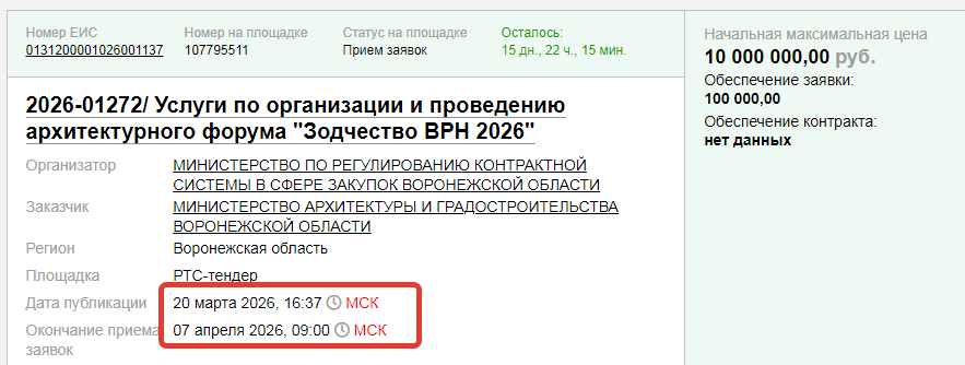 Эта информация содержится в материалах госзакупки на оказание услуг по организации и проведения архитектурного форума «Зодчество ВРН 2026». Исполнитель предстоящего мероприятия может стать известен в первой декаде апреля.