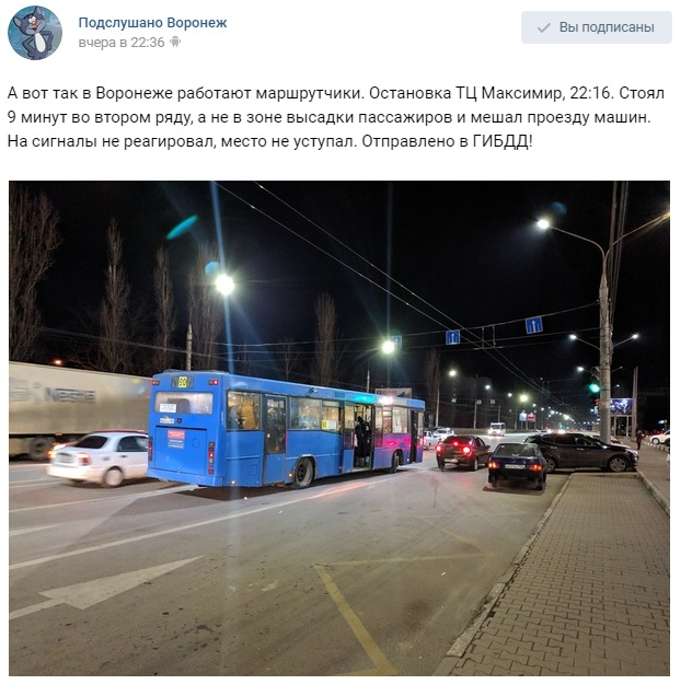 В Воронеже раскритиковали способ высадки пассажиров, который выбрал водитель автобуса, курсирующего по маршруту №90. В группе в соцсети «ВКонтакте» появилось сообщение о том, что поздно вечером 7 января он стоял у ТРЦ «Максимир», но не в крайнем ряду у остановки, а в среднем.