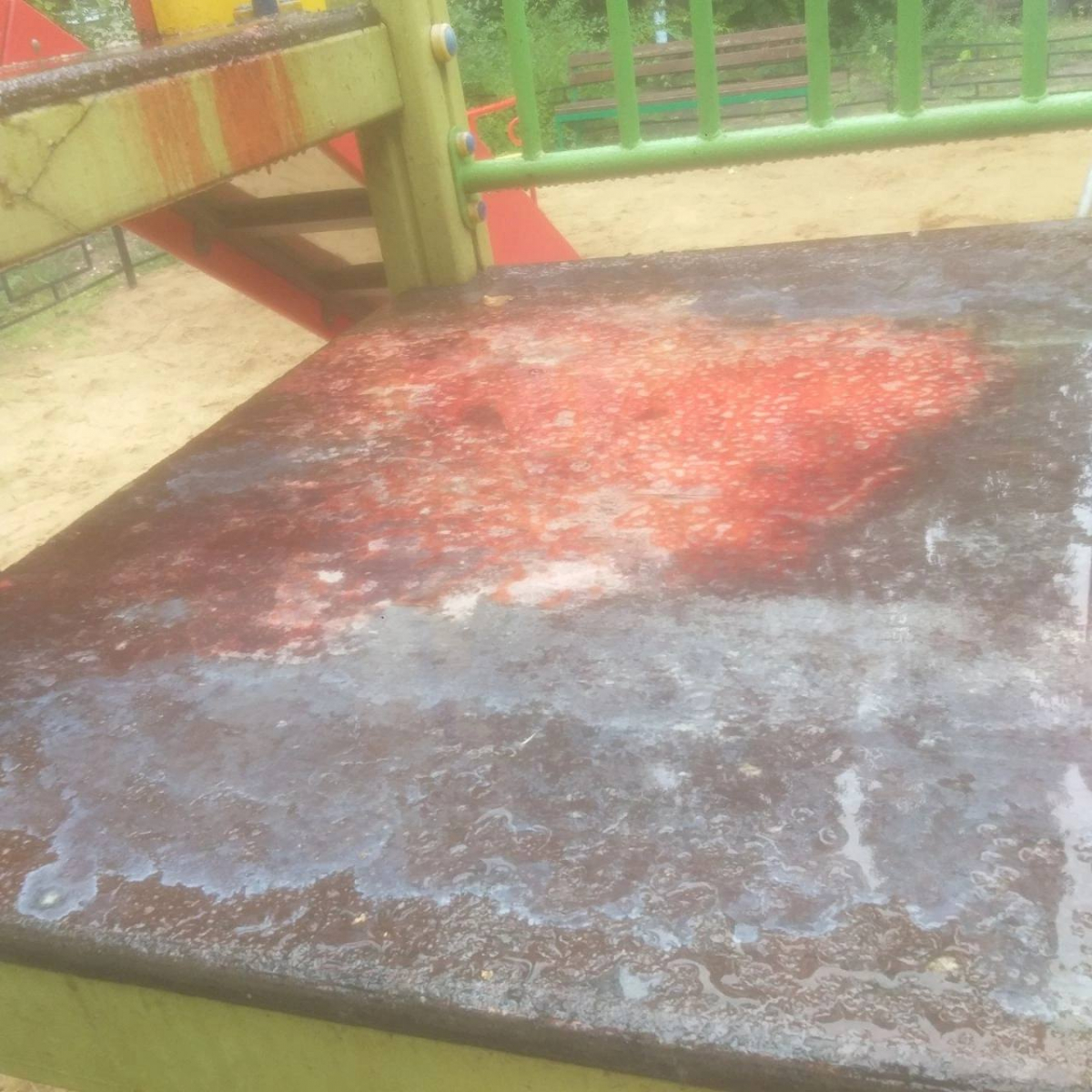 Жидкость не только загрязнила, но, вероятно, повредила покрытия игровых элементов, скамеек и детских игрушек.