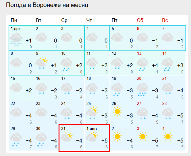 Осадки в виде снега, судя по прогнозу, придут в Воронеж уже 9 декабря. Правда, они будут вперемешку с дождем. Обильный снегопад обещают 20 декабря, а затем в столицу Черноземья будет наведываться небольшой снег. Температура в декабре не будет опускаться ниже –7 градусов, а в некоторые ночи и вовсе ожидается плюсовая температура.