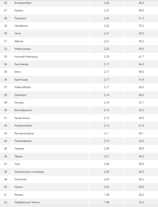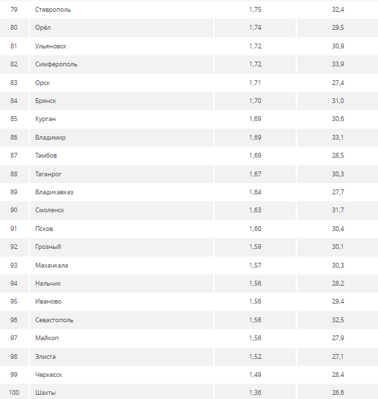 Лидирующие позицию в списке 100 городов занимают Москва, Южно-Сахалинск и Салехард. Рейтинг замыкают Шахты, Черкесск и Элиста.