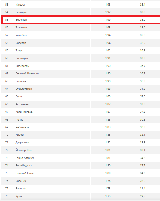 В рейтинге российских городов по уровню зарплат столица Черноземья не вошла даже в первую половину. Из 100 исследуемых населенных пунктов Воронежу досталась позиция на 55 месте.