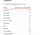 Первое место по числу ясных дней в февралей занимает Челябинск, там среднее число ясных дней занимает 5,5. Второе место занимает Краснодар – 4,5, а третье Красноярск – 4.