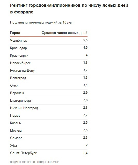Аналитики Яндекс Погоды изучили данные метеонаблюдений за последние 10 лет и выяснили, насколько ясной была февральская погода в российских городах-миллионниках.