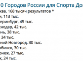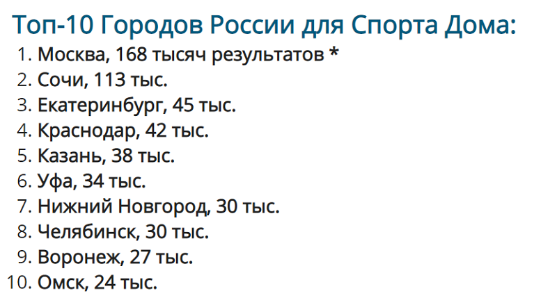 Так, согласно их данным, в первую десятку населенных пунктов вошли Москва (168 тысяч результатов), Сочи (113), Екатеринбург (45), Краснодар (42), Казань (38), Уфа (34), Нижний Новгород (30), Челябинск (30), Воронеж (27) и Омск (24).