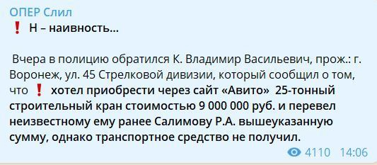 Воронежец заплатил мошеннику 9 млн рублей за несуществующий строительный кран, который он решил приобрести на сайте объявлений. Об этом сообщил Telegram-канал "ОПЕР слил" в среду, 4 июля.