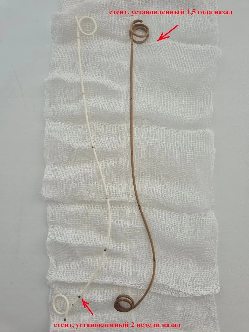 Пациент поступил в отделение урологии БСМП №8 с симптомами острого воспалительного процесса в мочевыводящих путях. Обследование, включавшее компьютерную томографию, УЗИ и лабораторные анализы, выявило причину: установленный полтора года наза
