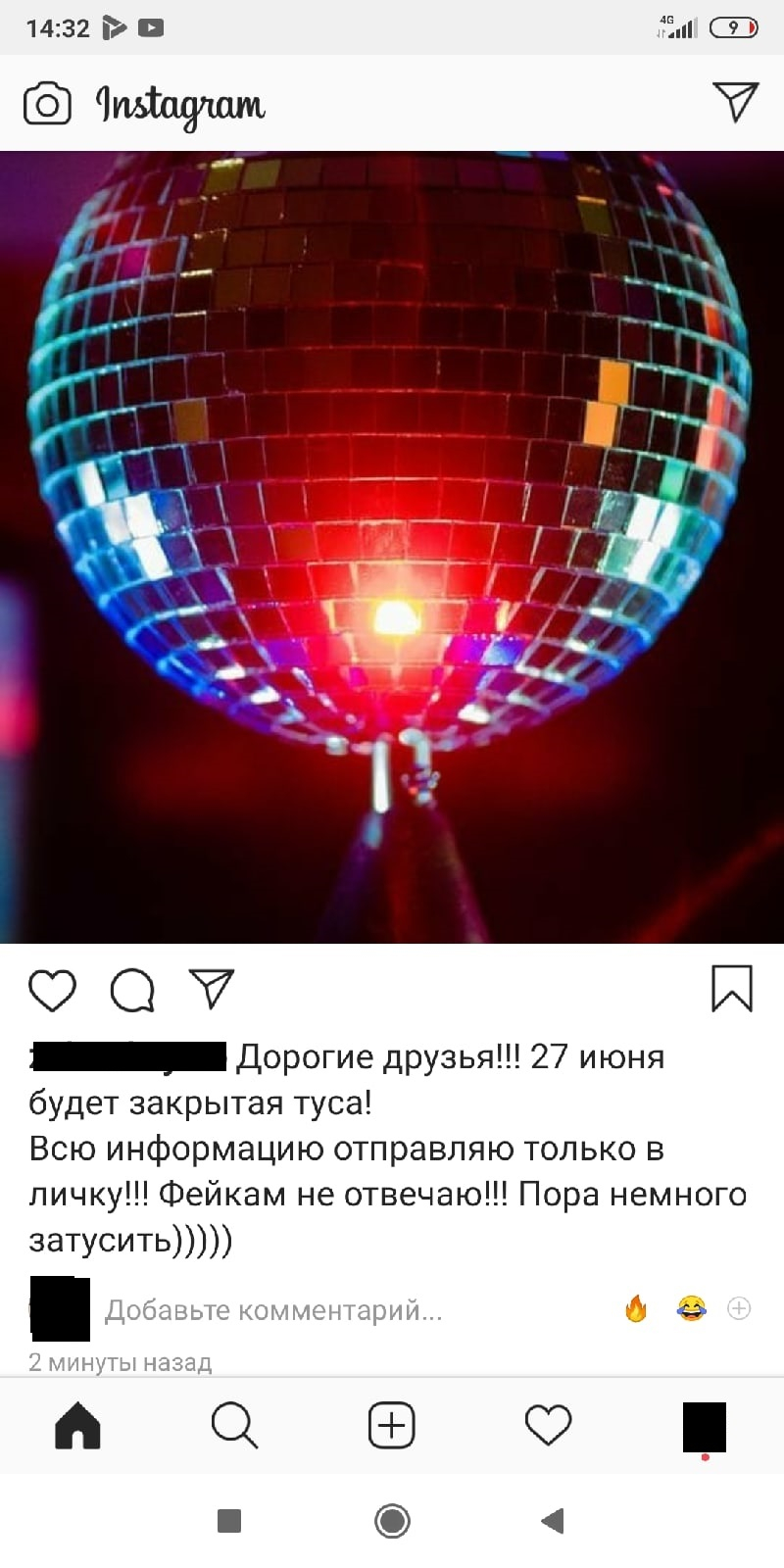 Воронежец прикрепил скриншот приглашения на закрытую вечеринку. Пользователь Instagram в этом обращении писал следующее: «Дорогие друзья! 27 июня будет закрытая туса! Всю информацию отправляю только в личку! Фейкам не отвечаю! Пора немного затусить», - гласило приглашение на вечеринку.