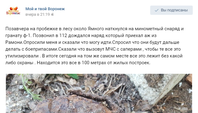 Местный житель Леонард сообщил землякам о странной находке в лесу около села Ямное. Там 23 августа во время пробежки воронежец обнаружил минометный снаряд и гранату.