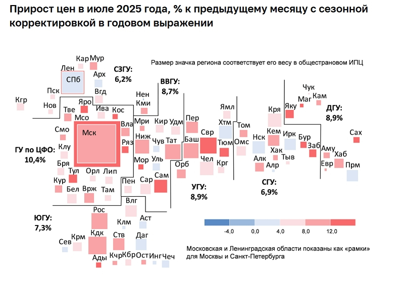 Центробанк России выпустил доклад «Региональная экономика». К докладу экономисты приложили карту, на которой отметили прирост цен в июле 2025 года с сезонной корректировкой в годовом выражении для каждого из регионов.