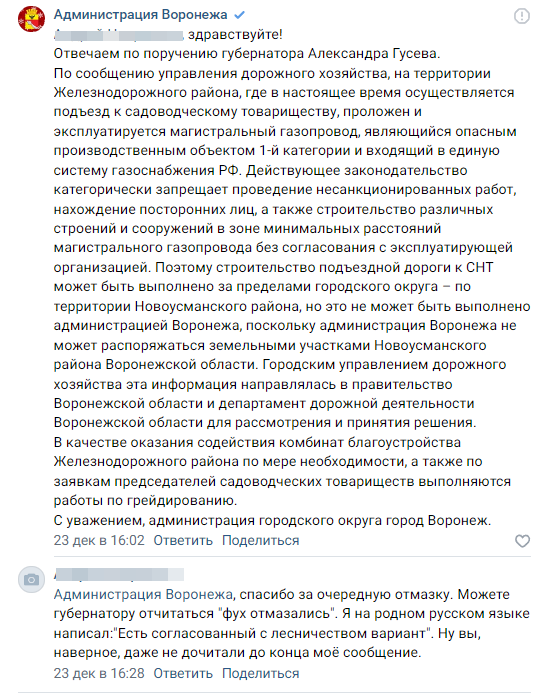 «По сообщению управления дорожного хозяйства, на территории Железнодорожного района, где в настоящее время осуществляется подъезд к садоводческому товариществу, проложен и эксплуатируется магистральный газопровод, являющийся опасным производственным объектом 1-й категории и входящий в единую систему газоснабжения РФ. Действующее законодательство категорически запрещает проведение несанкционированных работ, нахождение посторонних лиц, а также строительство различных строений и сооружений в зоне минимальных расстояний магистрального газопровода без согласования с эксплуатирующей организацией. Поэтому строительство подъездной дороги к СНТ может быть выполнено за пределами городского округа – по территории Новоусманского района, но это не может быть выполнено администрацией Воронежа, поскольку администрация Воронежа не может распоряжаться земельными участками Новоусманского района Воронежской области».