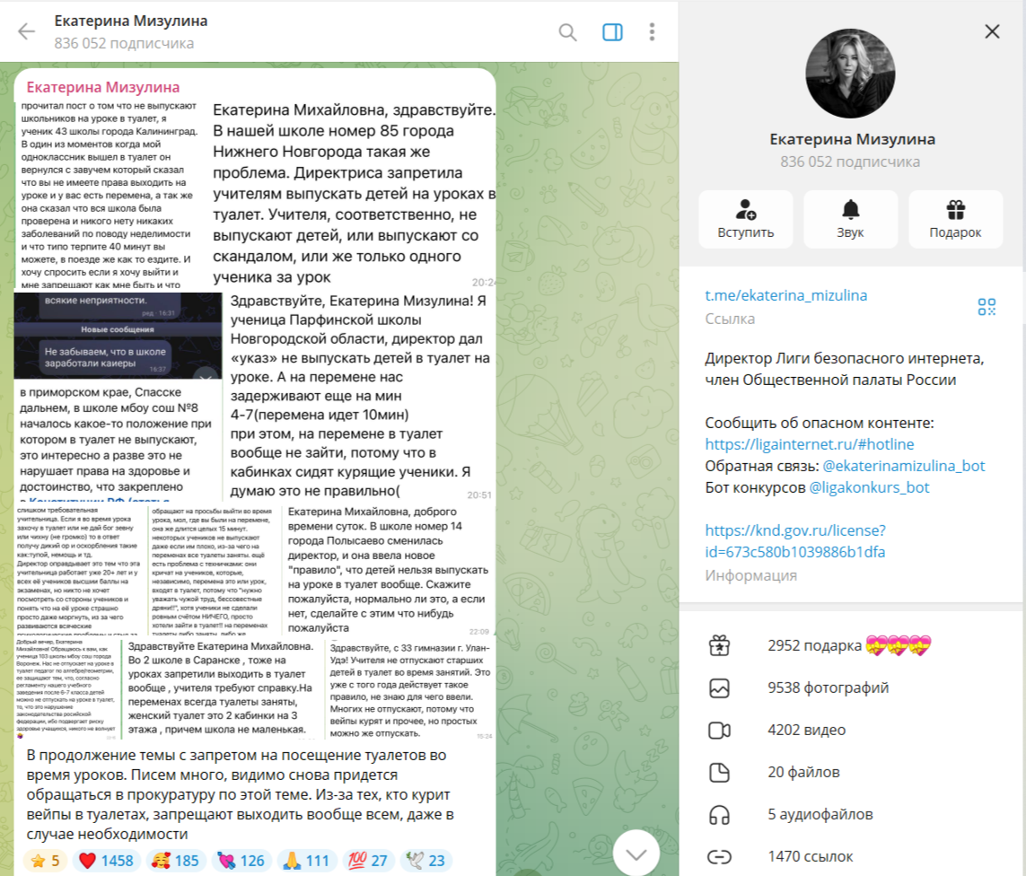 Глава Лиги безопасного интернета подтвердила, что подобные обращения поступают к ней регулярно и не только из Воронежа. По словам Мизулиной, ситуация связана с тем, что в школах разных регионов учителя начали вводить ограничения на посещение туалетов в учебное время из-за учащихся, которые используют вейпы в санузлах.