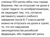 - Нас не отпускает на уроке в туалет педагог по алгебре/геометрии, ее защищают тем, что, согласно регламенту нашего учебного заведения, после 6-7 класса детей можно не отпускать на уроке в туалет. То, что это нарушение законодательства Российской Федерации, ибо подвергает риску здоровье учащихся, никого не волнует, - пишет одна из учениц воронежской школы.