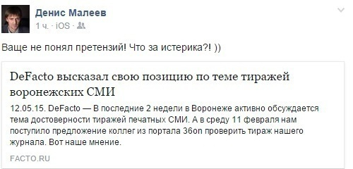 В ответ DeFacto (главный редактор Артем Сокольников - на фото ниже) опубликовал свою "позицию по теме тиражей воронежских СМИ", во многом посвященное коллегам из "36on".