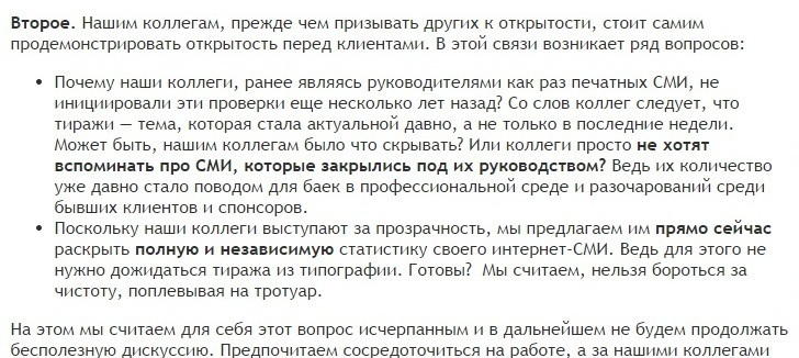 - ...мы не видим повода устраивать из этого шоу с приглашением журналистов, публикациями в СМИ и банкетом. Честные и открытые отношения с клиентами для нас — само собой разумеющееся, такой позиции мы будем следовать и в дальнейшем. Тираж ближайшего номера наши клиенты смогут пересчитать после 10 марта, когда журнал будет напечатан...