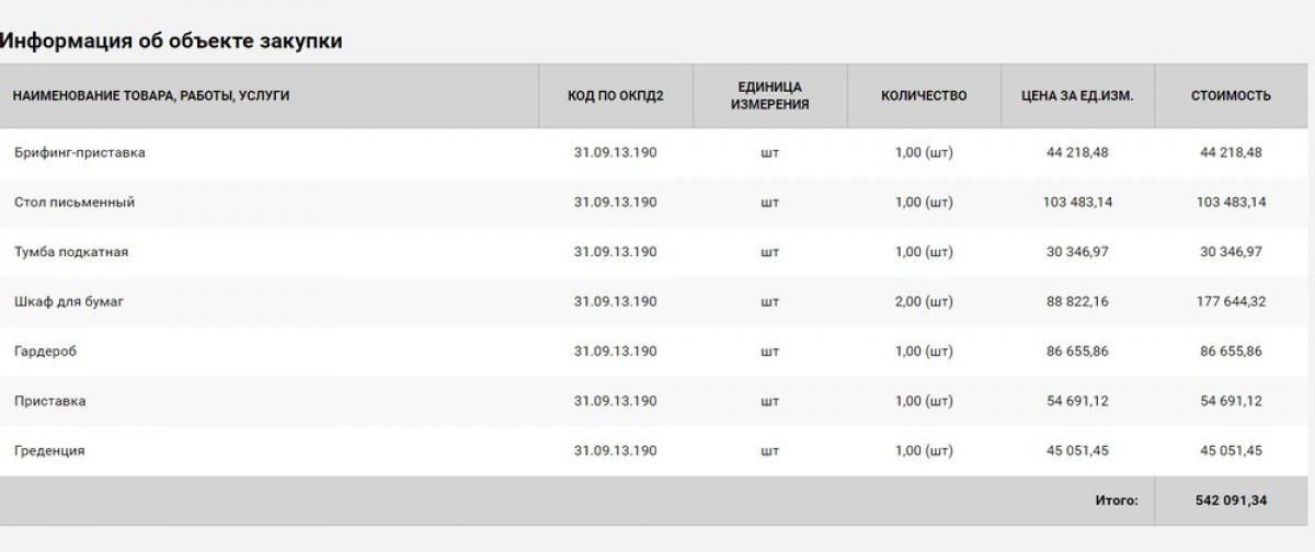 Ее стоимость превышает 542 тыс. рублей, а судя по номенклатуре товаров, речь может идти о покупке за казенный счет мебели всего для одного кабинета чиновника.