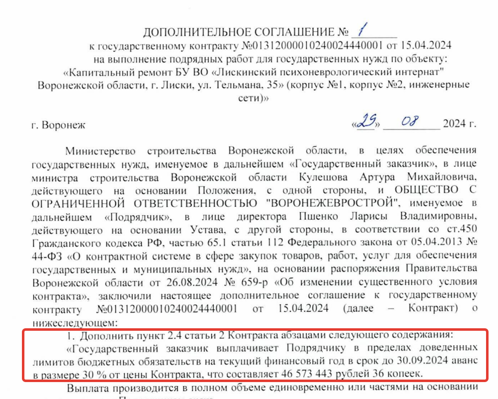 Кроме того, у бывшего подрядчика имеется пять неоплаченных штрафов на сумму свыше 7 млн рублей. Зачем минстрой занимается бюрократией, выписывает штрафы, если подрядчик их не оплачивает? Непонятна и "доброта" минстроя к этой организации: в подписанном (апрель 2024 г.) контракте с этой организацией ничего не говорилось о выплате ей аванса. Однако через несколько месяцев стороны внесли существенные изменения в документ, Артур Кулешов разрешил оплатить подрядчику аванс 30 процентов от цены контракта, что составило 46,5 млн.