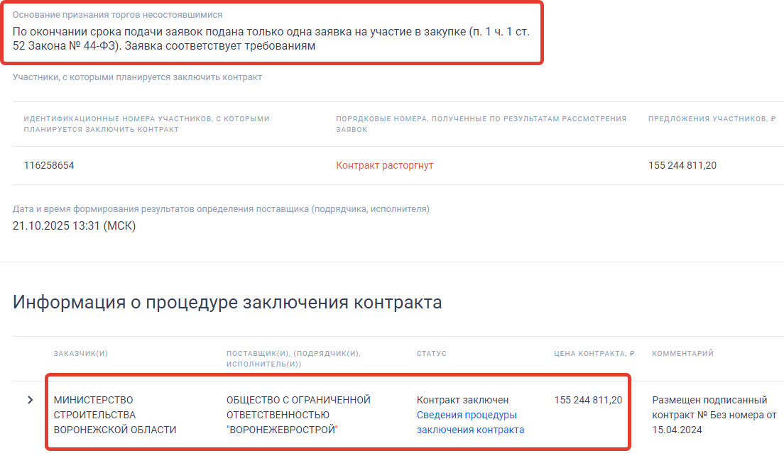 В арбитражной картотеке пока имеется только одно дело, в котором истец, минстрой и его организация БУ «Единая дирекция, пытаются через суд получить с «Воронежеврострой» 5,2 млн рублей в качестве штрафа и неустойки по контракту от ноября 2024 года, то есть, за срыв строительства поликлиники в Панинском районе. Это копейки, учитывая то, что размер «переплаты» минстроем по двум контрактам может быть около 63 млн. Не говоря уже о таких потерях бюджета области, как рост стоимости работ на завершение капремонта и строительства этих двух социальных объектов, а также продление сроков завершения работ, примерно, на год.