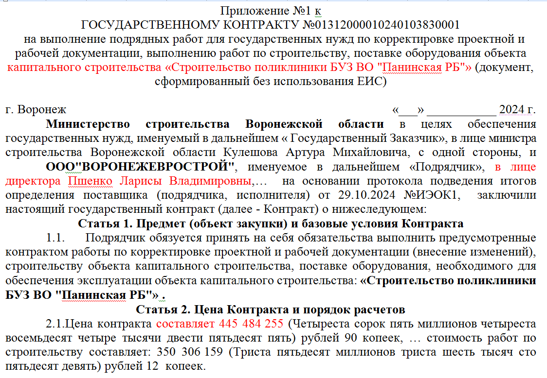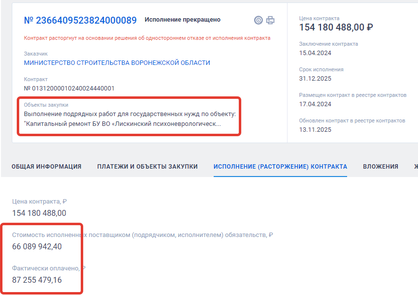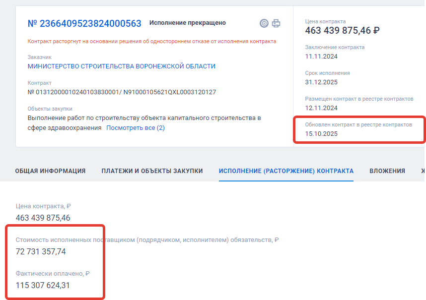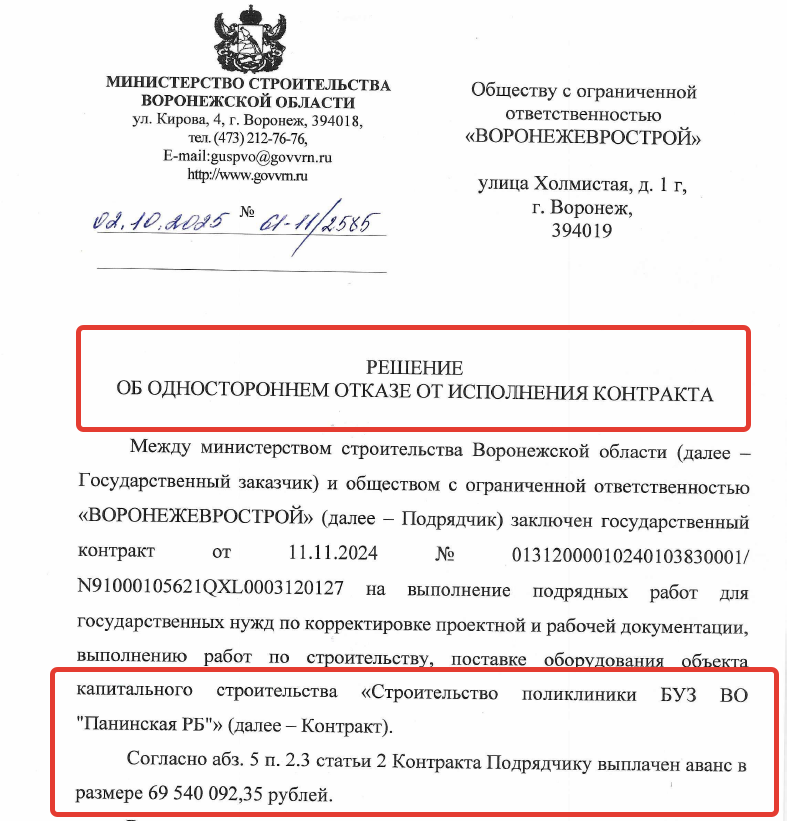 Еще в больших масштабах финансовых потерь бюджета области видится история по другому контракту, где то же заказчик, минстрой, подписал в ноябре прошлого года контракт с ООО «Воронежеврострой» на строительство поликлиники в Панинском районе. Стоимость работ - 445 млн рублей, это деньги федерального и областного бюджетов. Подрядчик должен был выполнить свои обязательства к 30 ноября 2025 года, то есть у него был в распоряжении календарный год. Размер аванса составлял 69,5 млн рублей.
