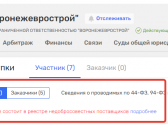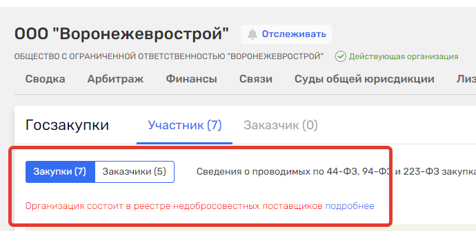 В открытых данных сообщается, что ООО «Воронежеврострой» состоит в реестре недобросовестных поставщиков и у него имеется налоговая задолженность.