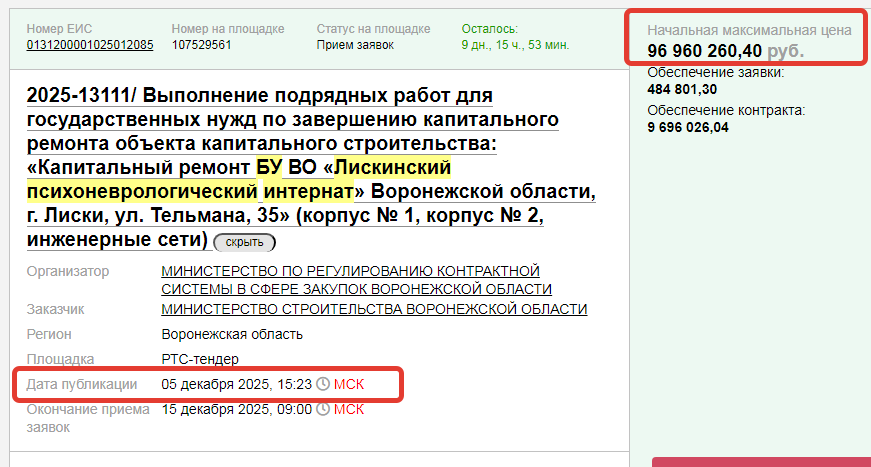 Начальная цена, объявленная заказчиком, 96,9 млн рублей. С учетом того, что «Воронежеврострой» ранее выполнил там работы на 66 млн рублей, то нынешняя всех работ уже может составить почти 163 млн рублей.