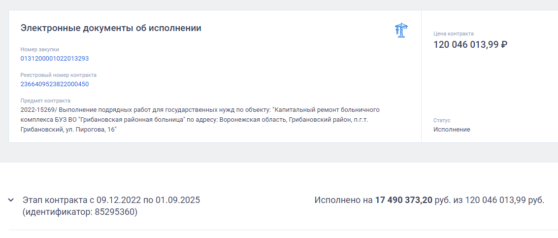 карточка исполнения контракта по капремонту здания Грибановской ЦРБ, данные сайта ЕИС
