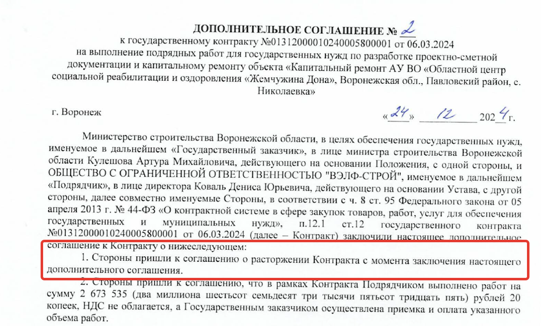 После чего, 24 декабря прошлого года, нынешний министр Кулешов, как госзаказчик, подписал с директором ООО «Вэлф-Строй» Денисом Коваль соглашение о расторжении контракта.