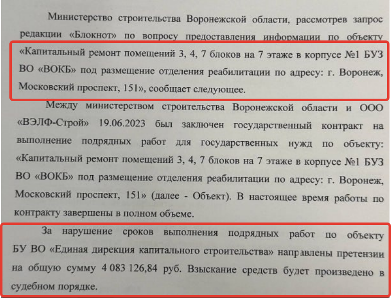 Тем более у них уже имелся положительный опыт такой работы в отношении этой строительной организации. Удивительное совпадение, но она в качестве подрядчика выполняла капитальный ремонт на этом же объекте – БУЗ «Воронежская областная клиническая больница №1», на Московском проспекте, 151, еще по раннему контракту – от мая 2021 года. И тогда заказчик, Департамент строительства, так же был недоволен работой этого подрядчика и подал на него исковое заявление в суд, сумма иска 420 тыс рублей.