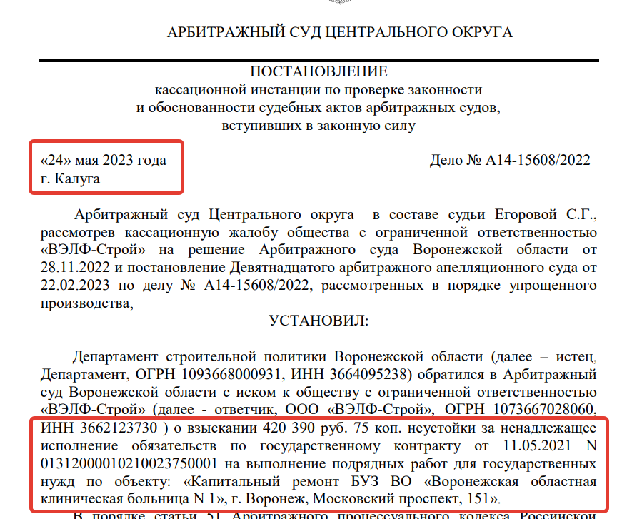 Исковые требования провинциального департамента строительства были удовлетворены в полном объеме, о чем было сообщено в мае 2023 года в постановлении Арбитражного суда Центрального округа. С ответчика ООО «Вэлф-Строй» несмотря на подачу им даже кассационной жалобы, суд взыскал 420 тысяч рублей.