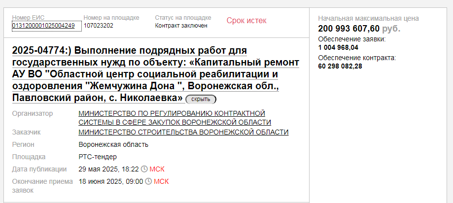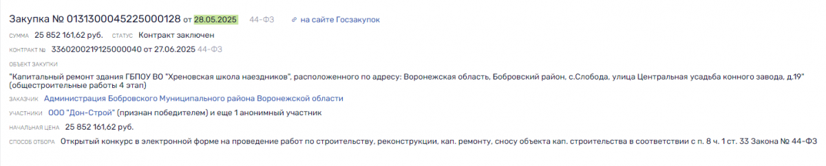 Интересно, что тремя неделями ранее администрация Бобровского района провела торги на капитальный ремонт «Хреновской школы наездников», стоимостью 25,8 млн рублей. А единственным участников и победителем чиновники «назначили» все тот же павловский «Дон-Строй». Работы должны быть выполнены до 1 марта 2026 года.