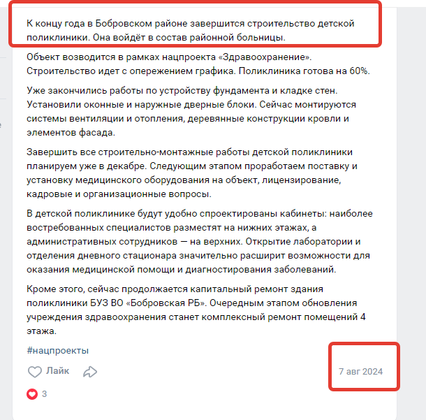 Но этого не произошло, хотя еще в августе прошлого года в соцсетях минстрой распространил информацию из ТГ-канала "Гусев", что «поликлиника готова на 60 процентов, а к концу года в Бобровском районе завершится строительство детской поликлиники. Она войдет в состав районной больницы».