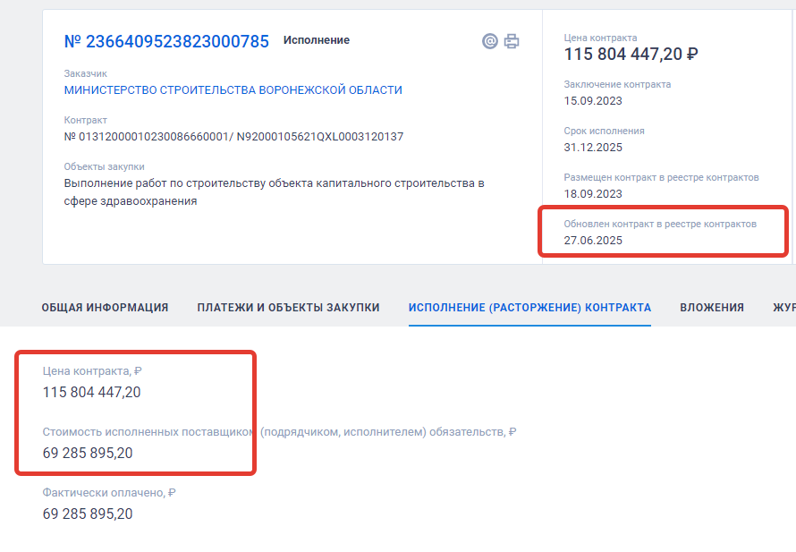 скриншот сайта госзакупок, карточка исполнения контракта по строительству детской поликлиники в г. Бобров, данные от 09.07.2025 г.