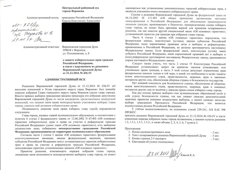 Так, активист Константин Квасов подал иск в Центральный районный суд Воронежа. Общественник указал, что решение представителей городского парламента противоречит федеральному закону «Об основных гарантиях избирательных прав и права на участие в референдуме граждан Российской Федерации». В нем говорится, что глава муниципальное образования есть выборное должностное лицо, избираемое непосредственно гражданами Российской Федерации, проживающими на территории муниципального образования.