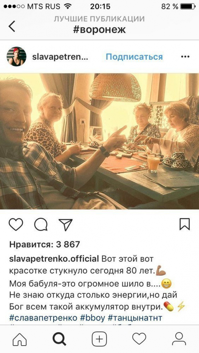 Участник 1-го сезона проекта «Танцы» на канале ТНТ, представлявший Воронеж, в субботу поразил своих поклонников необычным снимком. На нем Вячеслав Петренко, которого на шоу все знали, как SLAVA, на фотографии сидит в ресторанчике. Его окружают три дамы бальзаковского возраста. На одну из них Вячеслав показывает пальцем и ниже комментирует: