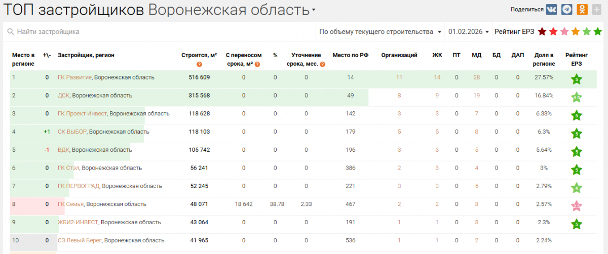 На 1 февраля, лидирующую позицию занимает ГК «Развитие». По данным рейтинга, компания строит более 516 тыс квадратов, имеет в регионе долю 27,5%, а суммарно по всем показателям занимает 14 строчку во всероссийском рейтинге застройщиков.