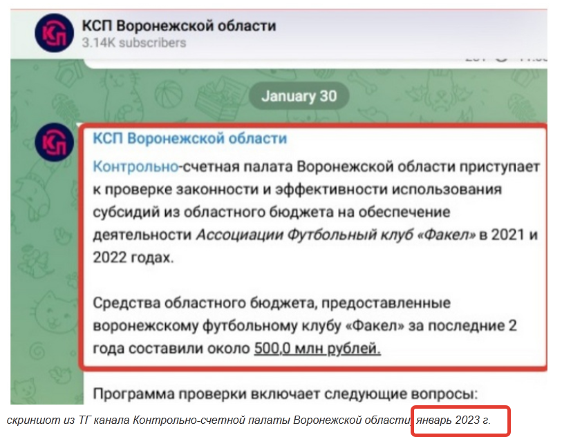 Также до сих пор, уже почти три года, не раскрывается информация Контрольно-счетной палаты Воронежской области о итогах ее проверки использования АФК «Факел» 500 млн бюджетных средств в 2021-2022 гг.