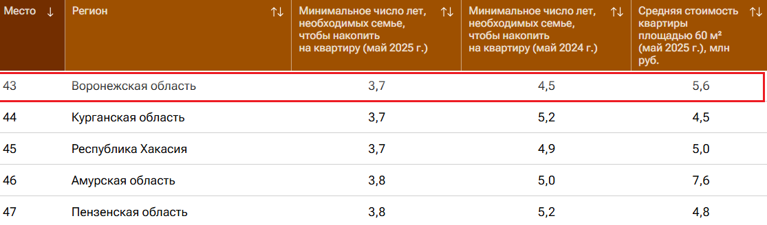 По расчетам Центра, среднестатистическая воронежская семья из двух взрослых и одного ребенка способна подужаться и за 3,7 лет накопить себе денег на квартиру площадью в 60 квадратных метров на вторичном рынке. Годом ранее требовалось 4,5 года.