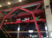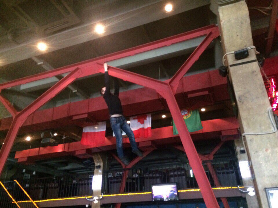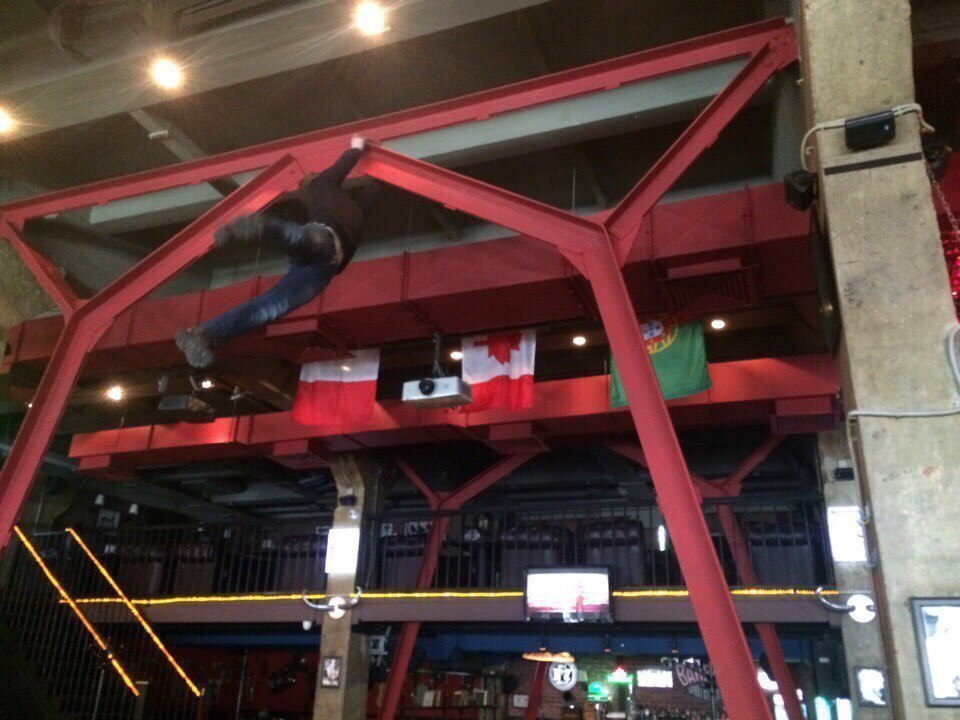 На фото видно, как в одном из излюбленных баров воронежской молодежи молодой человек держится руками за металлическую ферму под потолком. При этом молодой человек начинает выполнять акробатические упражнения.