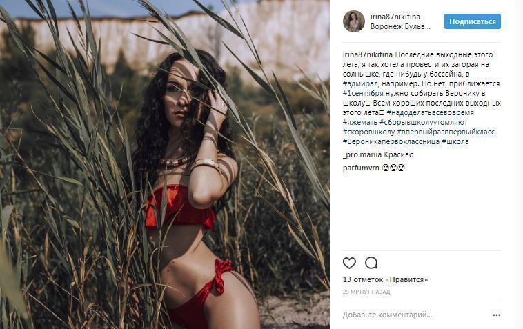 Пользователь Instagram irina87nikitina разместила сексуальное селфи, сделанное в комплексе «Белый колодец». На нем девушка стоит в камышах в красном бикини, подобно древней амазонке. При этом Ирина указывает, что хотела вместо этого позагорать в бассейне в каком-нибудь клубе. Однако ей помешала маленькая дочка.