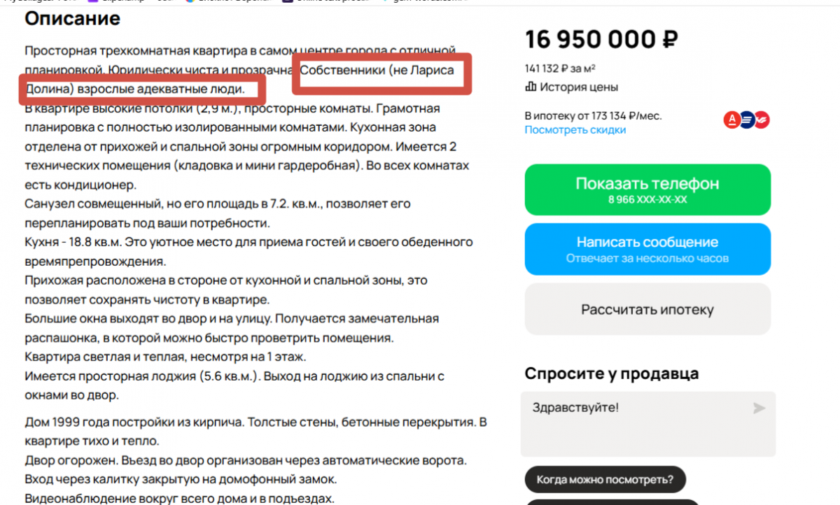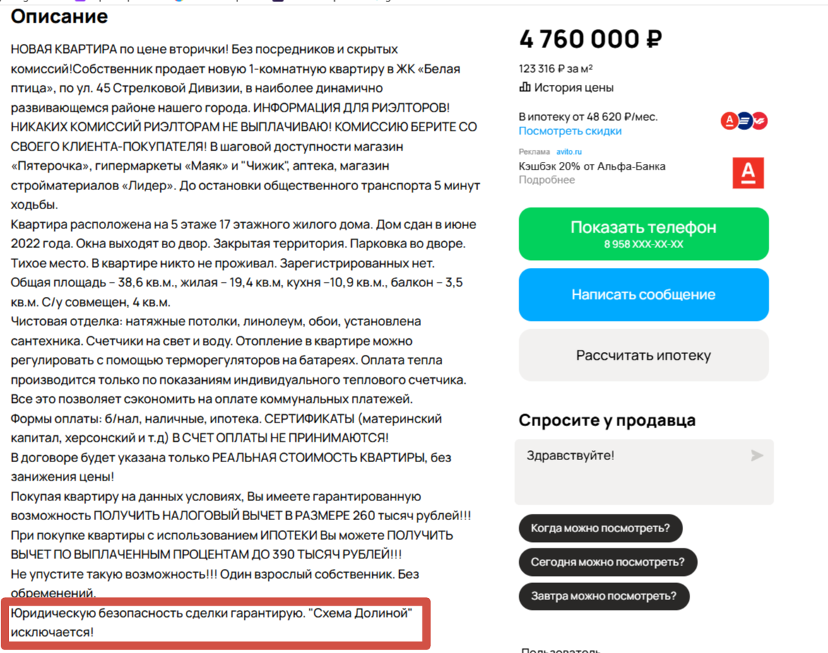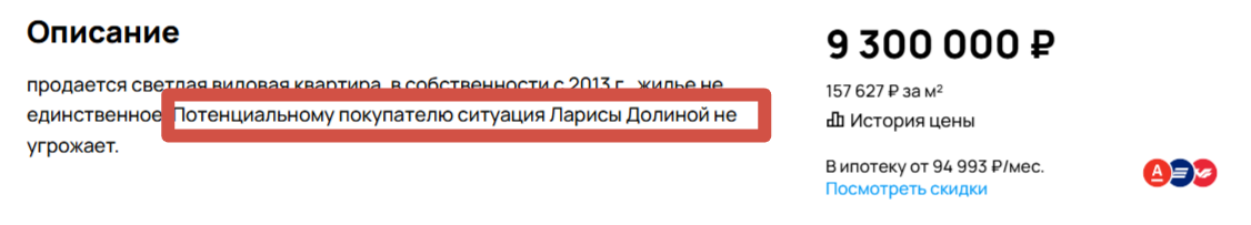 «Юридическую безопасность сделки гарантирую. «Схема Долиной» исключается», «Потенциальному покупателю ситуация Ларисы Долиной не угрожает», «Собственники (нe Лapиca Дoлинa) взpослые адекватные люди», - пишу в различных объявлениях на сайте «Авито» в Воронеже.
