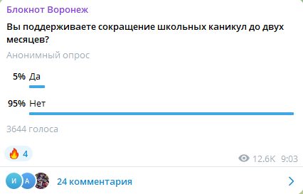 Когда вице-спикер Государственной Думы от ЛДПР Борис Чернышов встал на защиту школьных каникул, «Блокнот Воронеж» в своем телеграм-канале спросил своих читателей, как они относятся к идее детского омбудсмена Москвы Ольги Ярославской, которая считала, что ученикам достаточно для отдыха и двух месяцев.