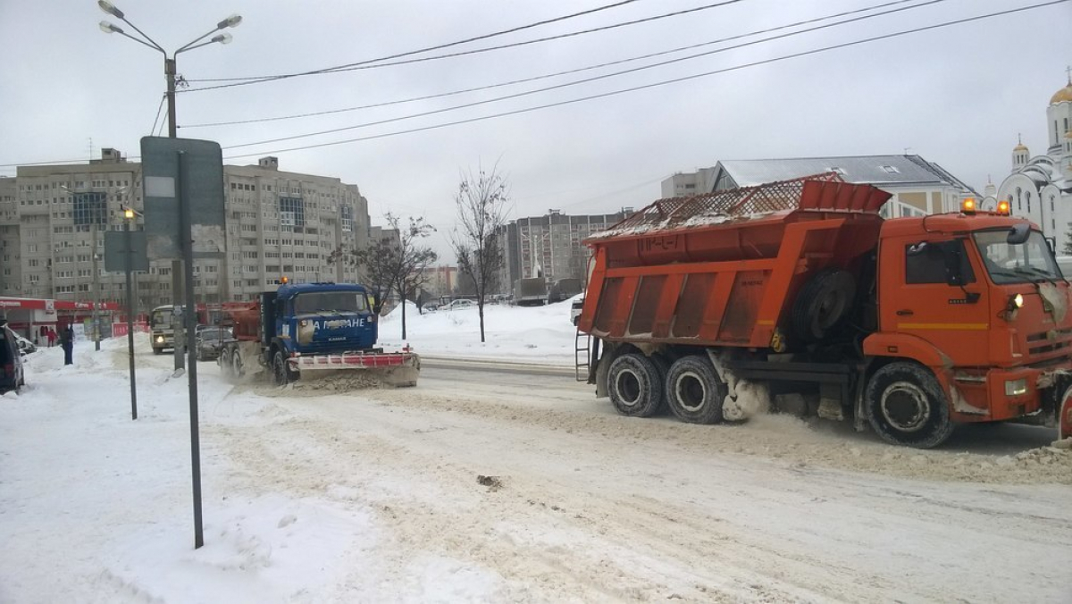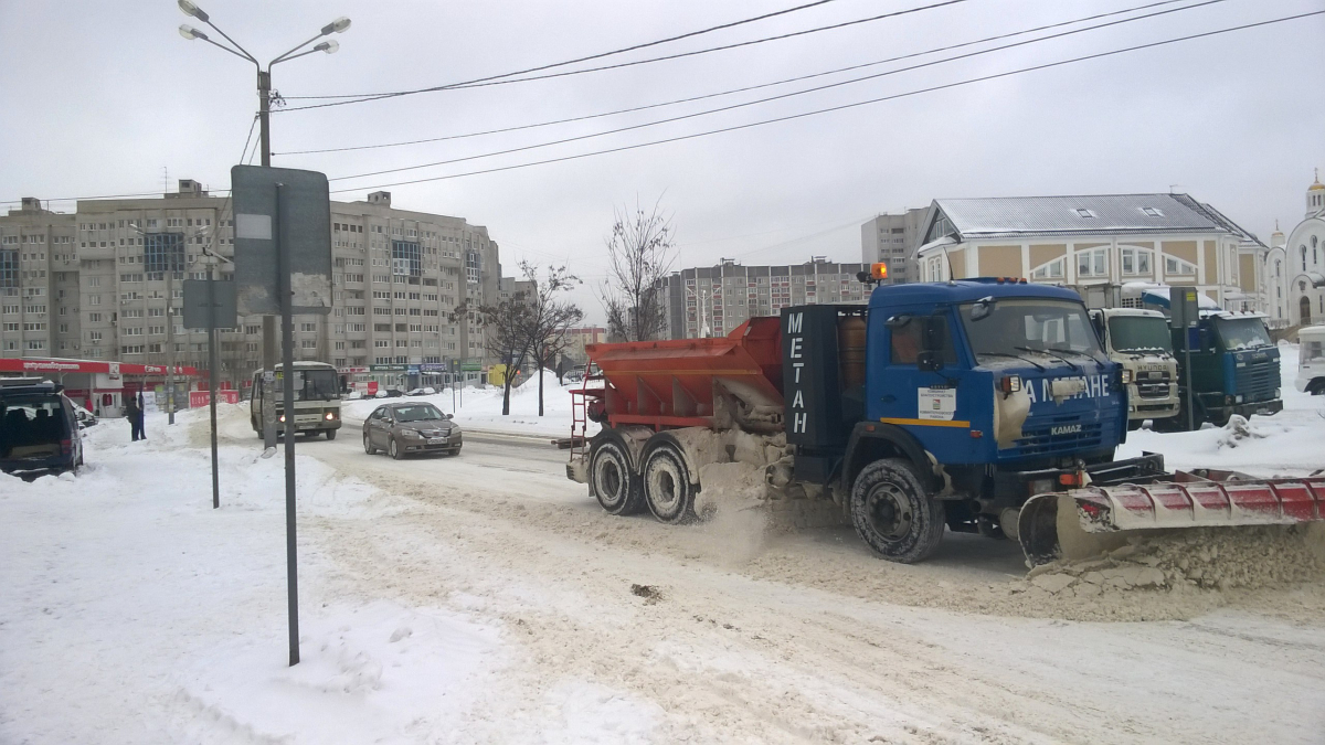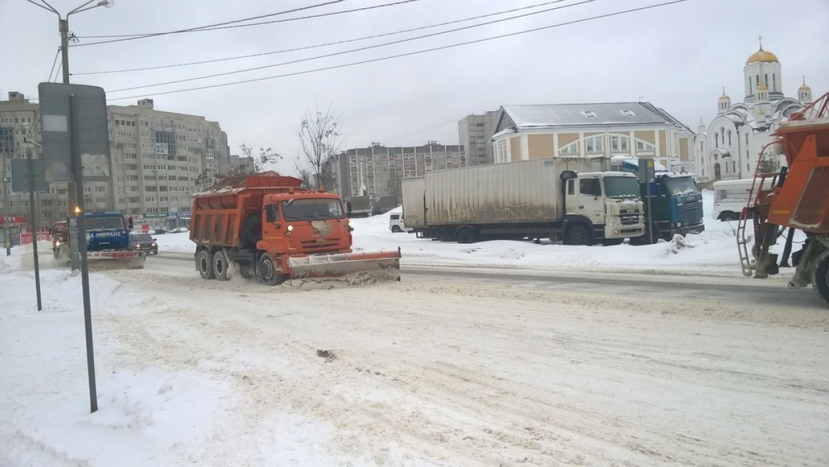 Снегоуборочные машины ехали по улице Владимира Невского в районе остановки общественного транспорта «Храм».