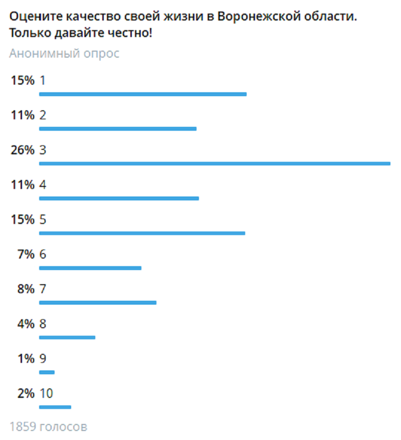 Обнаружив, что чиновники решили объединить усилия для борьбы за высокое качество жизни воронежцев, мы в своем телеграм-канале предложили читателям оценить стартовые позиции. То есть, как жители города оценивают свое качество жизни прямо сейчас. Для наглядности в голосовалке использовали классическую десятибалльную шкалу.